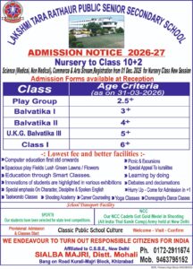LAKSHMI TARA RATHAUR PUBLIC SCHOOL is an English Medium School dedicated to the memory of late mother Smt. Lakshmi Devi dedicated to the memory of late mother Smt. Lakshmi Devi and late wife Smt. Tara Rathaur of Maj. Gen. Sher Jang Rathaur VSM Capt. Amrinder Singh, ertwhile Honorable Chief Minister of Punjab very graciously opened it to the public on 29th Nov, 2004.